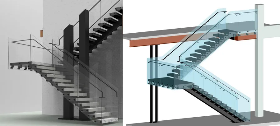 However, the client's desire for a sleeker, more modern aesthetic prompted us to reimagine the staircase's structure and visual impact. The final concept took shape by embedding the structural support into the wall, eliminating visible supports and achieving a breathtaking floating effect that defies physics.