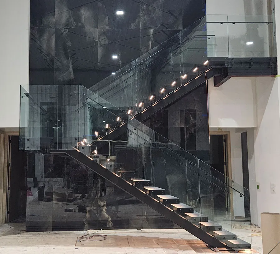 The staircase's 3" thick treads are crafted to support custom tilework, seamlessly blending practicality with style. Sleek glass railings and minimalist black steel handrails enhance its modern appeal, creating clean lines that elevate the space.